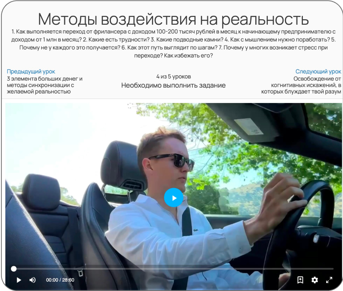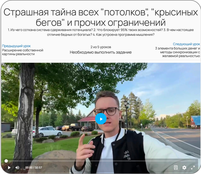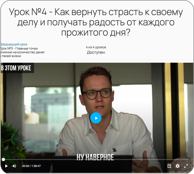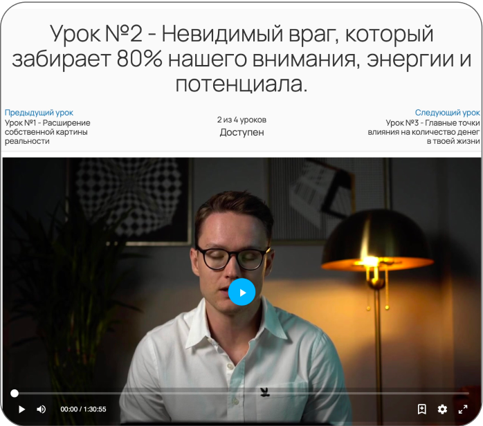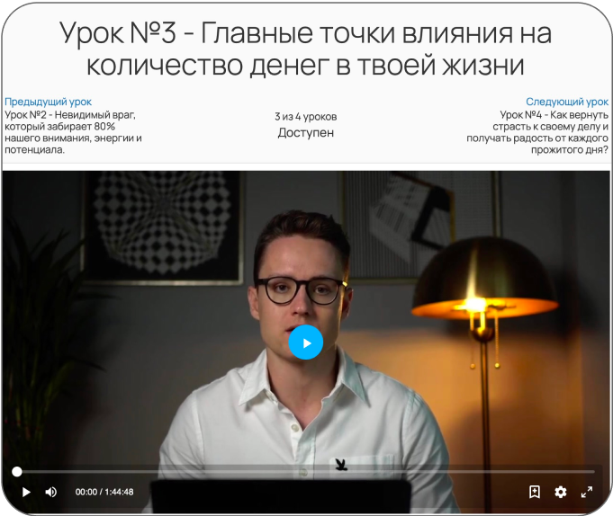 Часть системы “ДРУГАЯ ЖИЗНЬ” - это обучение из 6 уроков на специальной платформе. Уроки можно смотреть через телефон или компьютер в любое удобное время